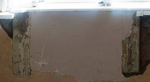 The hardest part was just below the windowsill where there are two wooden blocks inserted into the wall as shown by the rectangle in the image to the right, I think there may have been a wash basin attached to them in the past, as part of the windowsill was cut away in the same location. you can click here for a larger view of the blocks. The plaster especially that to the right of the right hand block was very flaky and also bulged out from the wall.