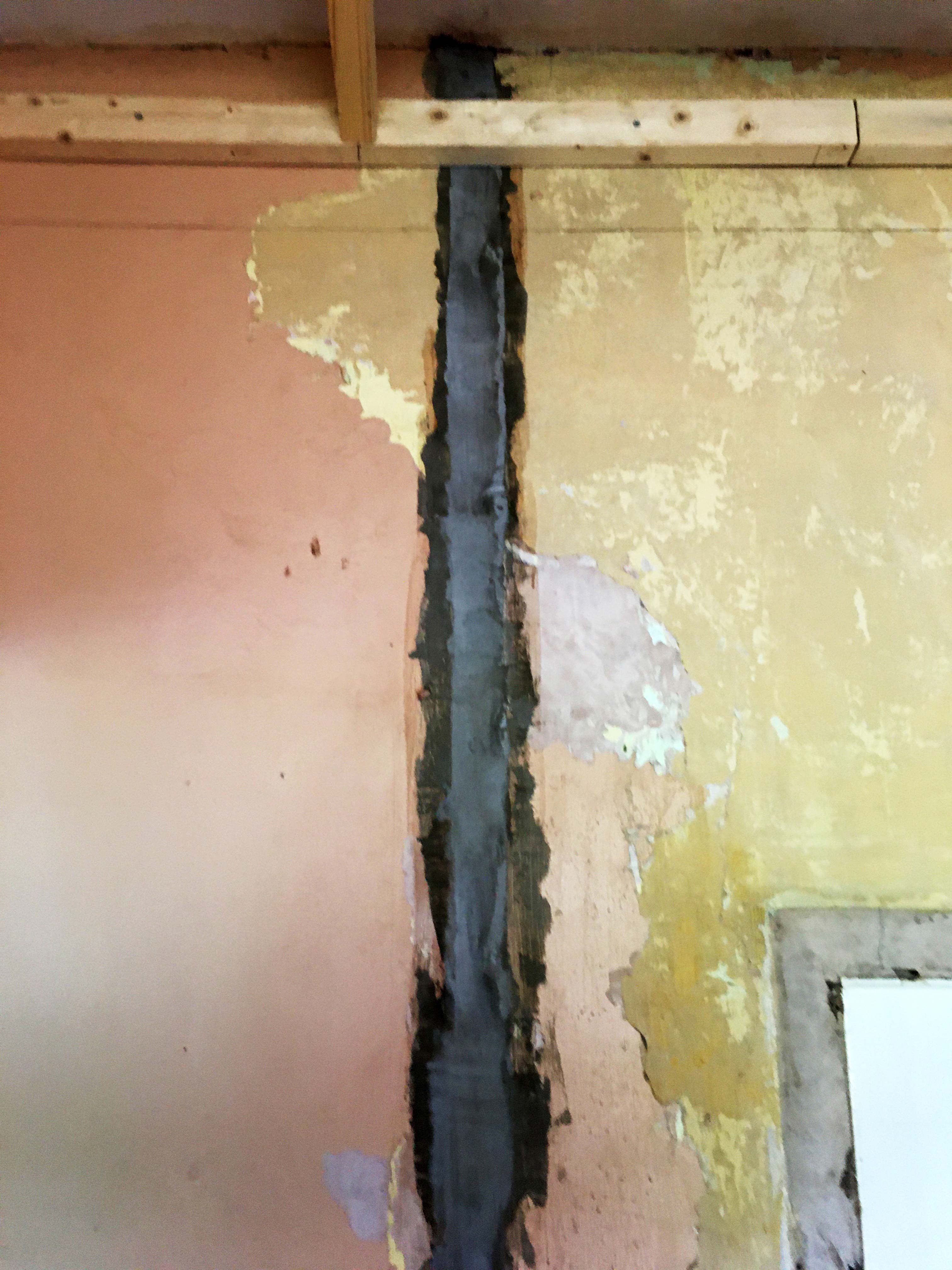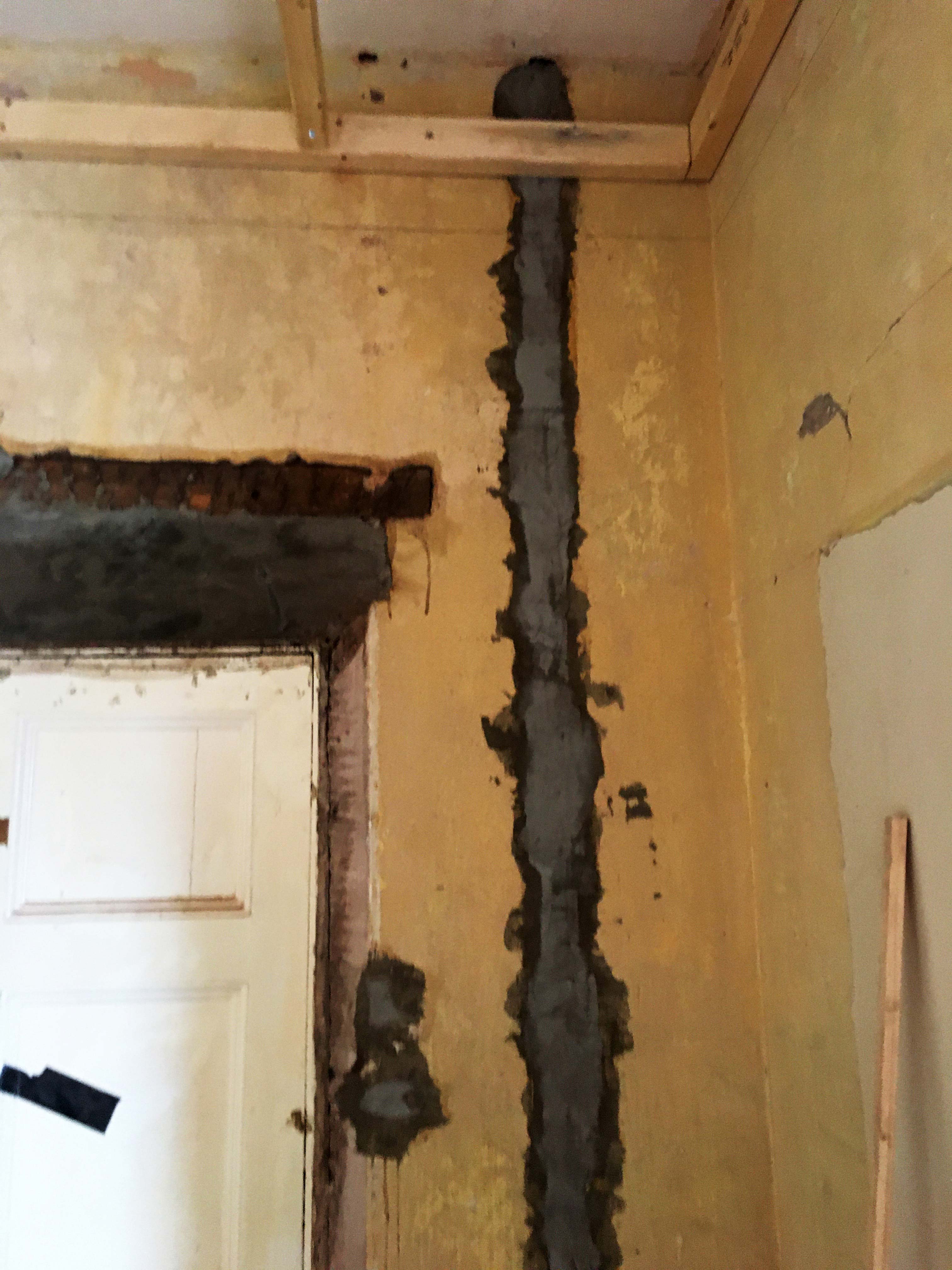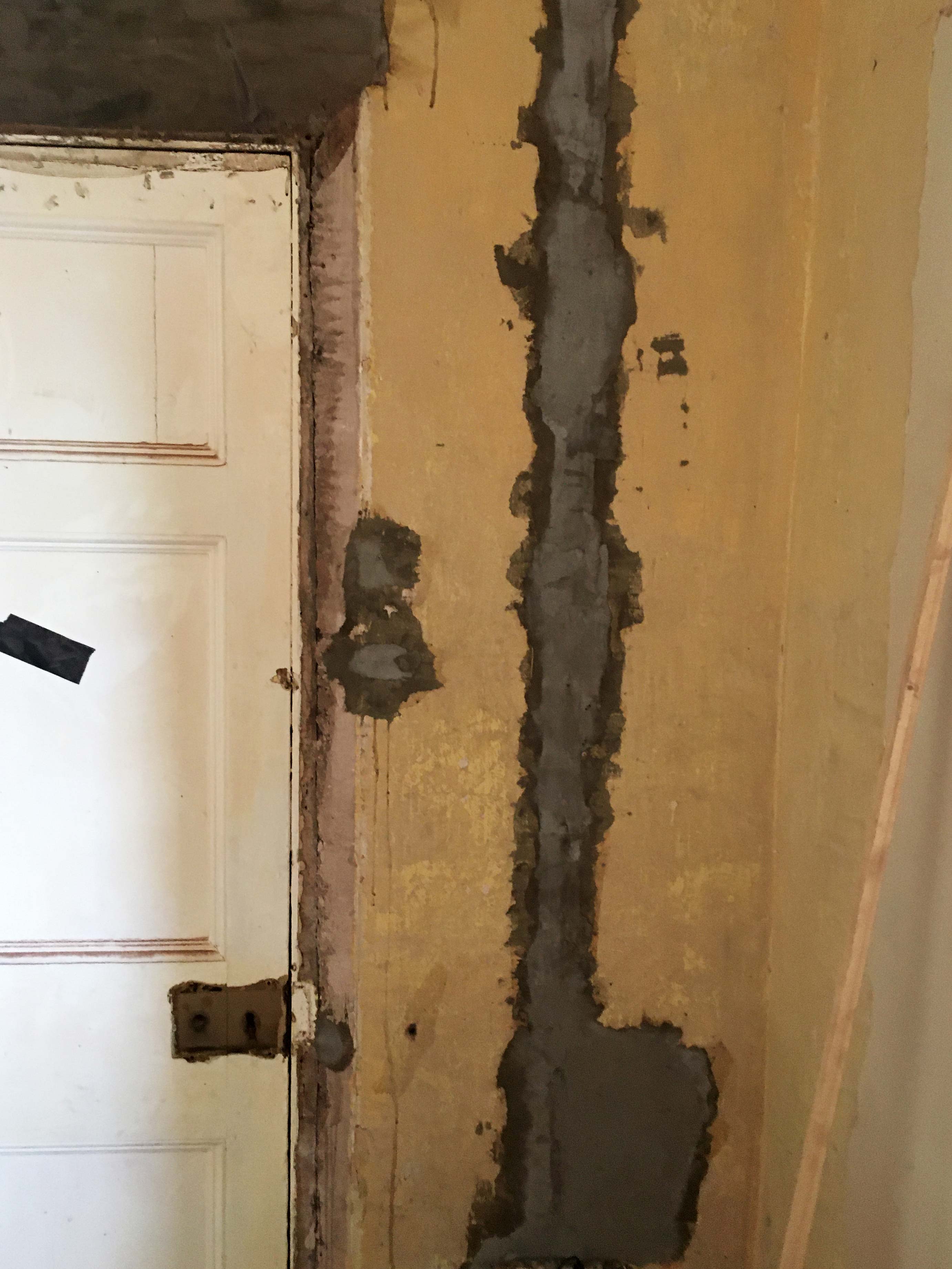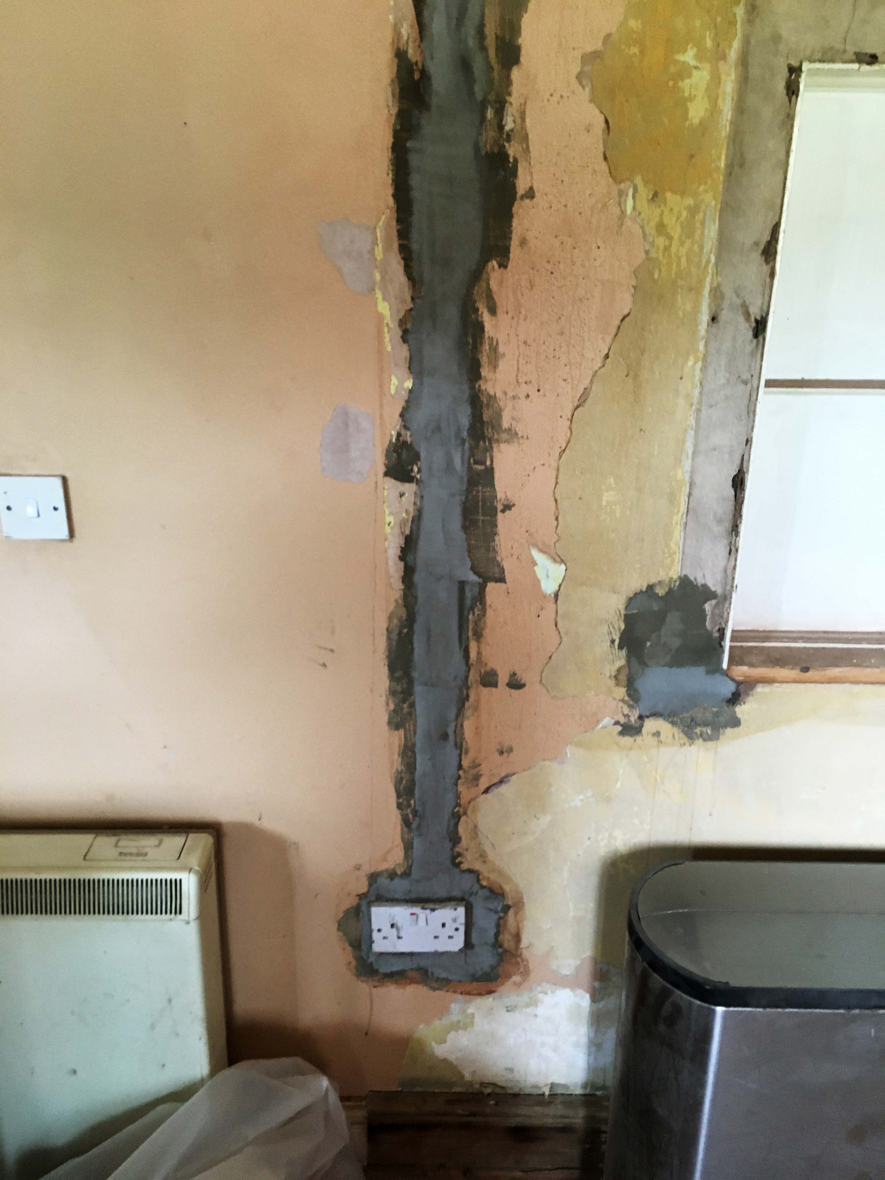 The next set of images just show the conduit that had been screwed to the wall, has now been buried in cement ready to be plastered over. This one shows the bit above the door where the original plaster has been removed and has been partially cemented over in preparation to be plastered.
