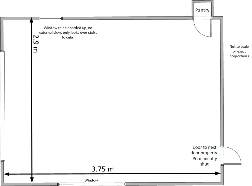 As you can see from the plan next/below this text, the shape of the room isn't too dramatic, only this is only half of the kitchen. It used to be the pantry when my grandad was alive, but when he died and the house was prepared for renting out, the kitchen and pantry were knocked together into one room, which in some ways makes the renovation a little easier and removes a little urgency as we can have one operational kitchen while I do this one up.